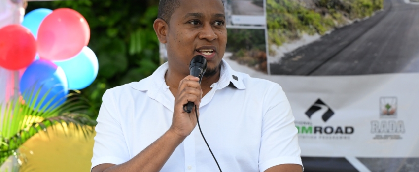 Minister of Agriculture, Fisheries and Mining, Hon. Floyd Green, delivers the main address during the official opening of the Platfield to Brainerd Farm Road in St. Mary on Wednesday (May 7).
