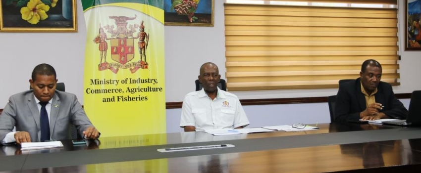 Minister without Portfolio in the Ministry of Industry, Commerce, Agriculture and Fisheries, Hon. J.C. Hutchinson (centre), addresses a press conference at the Ministry’s Hope Gardens offices in Kingston on March 31. Others from left are State Minister, Hon. Floyd Green and Chief Executive Officer of the Rural Agricultural Development Authority (RADA), Peter Thompson.