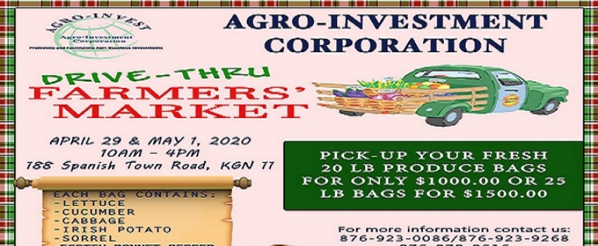 KINGSTON, Jamaica– The Agro-Investment Corporation, located at the AMC Complex, 188 Spanish Town Road, will be hosting its very first Drive-Thru Farmers’ Market on April 29 and May 1, 2020 and the Media is invited to cover this novel farmers’ market. “Farmers markets play a critical role in providing fresh, nutritious and locally-produced food products to customers across Jamaica” and this initiative has been developed in an effort to collaborate with farmers and purveyors across the country in getting excess fresh produce sold. Our Agro Parks with its Global Gap Certification, along with other certified farms will be supplying the fresh vegetables and ground provisions.