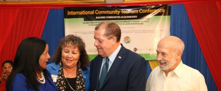 Gillian Rowland (left), Vice-President of the International Institute for Peace through Tourism (IIPT) Caribbean, presents compact disc of conference presentations to the Hon Audley Shaw, Minister of Industry, Commerce, Agriculture and Fisheries, at the International Community Tourism Conference on November 13 at the University of the West Indies in St. St. Andrew. Others from left are Diana McIntyre-Pike, President/Founder Countrystyle Villages as Businesses and IIPT Caribbean President, and Dr. Louis D’Amore, International Institute for Peace through Tourism Founder. Minister Shaw encouraged the participants, representing Jamaican and Caribbean community tourism groups, not to see Airbnb as a competitor to community tourism but rather embrace it and use it as a platform to reach the world.