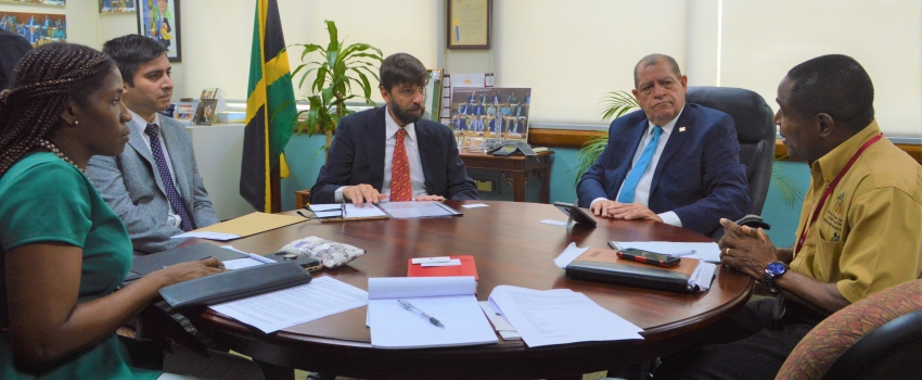 Minister of Industry Commerce, Agriculture and Fisheries, Hon. Audley Shaw (2nd right), in discussion with (from left) Acting Chief Technical Director in the Ministry, Monique Gibbs; Deputy Head of Mission, Argentina, Patricio Uruena Palacio; Ambassador of Argentina, H.E. Luis Del Solar; and Chief Veterinary Officer in the Ministry, Dr. Osbil Watson, during a courtesy call at the Ministry’s New Kingston offices on Tuesday, July 2, 2019. Matters discussed included the strengthening of technical cooperation and the possibilities for expanding trade between Jamaica and Argentina.