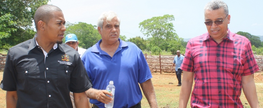 State Minister in the Industry, Commerce, Agriculture and Fisheries Ministry, Hon. Floyd Green (left), makes a point to Managing Director of Everything Fresh, Courtney Pullen (right), at a joint annual general meeting of the Jamaica Red Poll Cattle Breeders Society and Jamaica Black Cattle Breeders Society at the Minard Estate in St. Ann on July 17. Listening in is member of the Jamaica Red Poll Cattle breeders Society, José DeSousa.