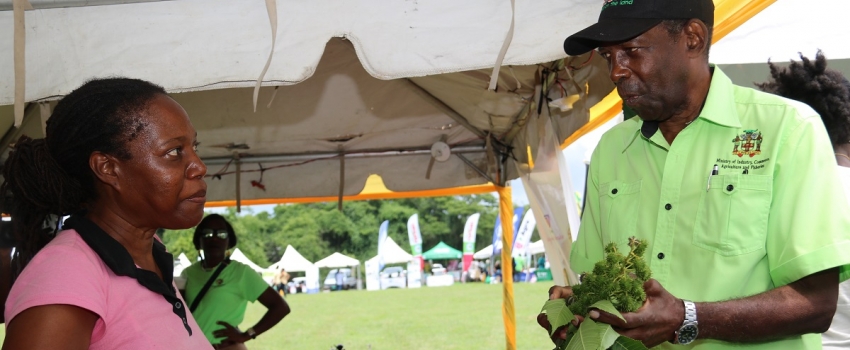 Hon J.C. Hutchinson, Minister without Portfolio in the Ministry of Industry, Commerce, Agriculture and Fisheries, discusses castor beans with Madge Corniffe, owner of Gestan Hills Nature’s Beauty & Delight manufacturers of castor oil and coconut oil, at the 4th staging of the Hanover Agricultural Show held in Lucea, Hanover, on May 25.