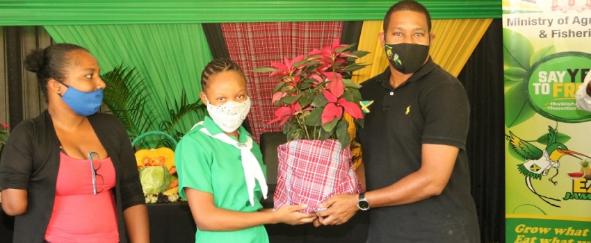 Minister of Agriculture and Fisheries, Hon. Floyd Green (right), presents Jamaica 4-H Club member and student of the Papine High School, Rihanna Simpson (centre) with a poinsettia at the Eat Jamaican Day National Ceremony on the lawns of the Agriculture and Fisheries Ministry in Kingston on November 25. At left is her teacher, Jodian Thomas.