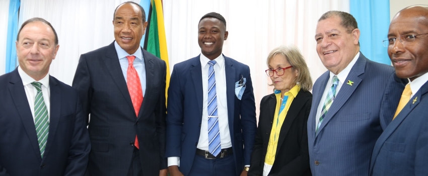 Industry, Commerce, Agriculture and Fisheries Minister, Hon. Audley Shaw (second right), shares a photo opportunity with (from left) Honorary Consul of Israel to Jamaica, Gideon Siterman; Chairman of the Economic Growth Council (EGC) Michael Lee-Chin; College of Agricultural Science and Education (CASE) student Chadewade Anderson; Chairperson of the National Bank of Jamaica Foundation, Thalia Lyn, and Chief Executive Officer of the EGC, Senator Aubyn Hill. Occasion was a briefing at the Ministry’s St. Lucia Avenue offices in New Kingston on November 20 with 15 CASE students who will be travelling to Israel to pursue an 11-month international programme in advanced technology and training in agriculture.