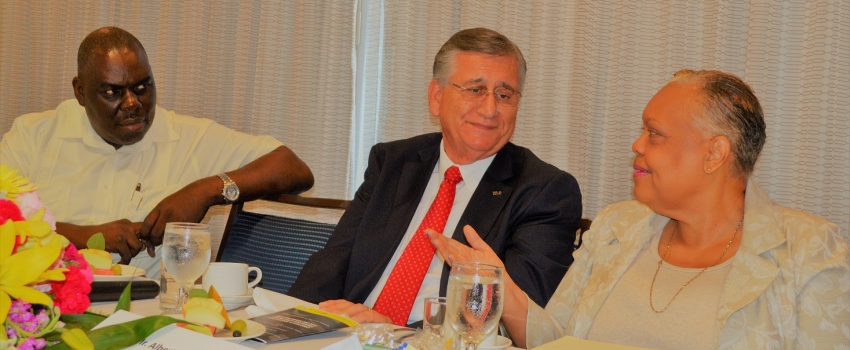 CEO, Jamaica Business Development Corporation (JBDC), Valerie Veira (right), in discussion with Executive Director, South West Texas Border, SBDC Network, Albert Salgado (centre) and Permanent Secretary in the Ministry of Industry, Commerce, Agriculture and Fisheries (MICAF), Donovan Stanberry, at the Courtyard Marriott hotel, New Kingston, on Wednesday, May 2, 2018. Occasion was a CEO Breakfast Forum hosted by MICAF in collaboration with the Organization of American States and JBDC, under the theme “Creative and Innovative Financing Strategies for the MSME Sector”.