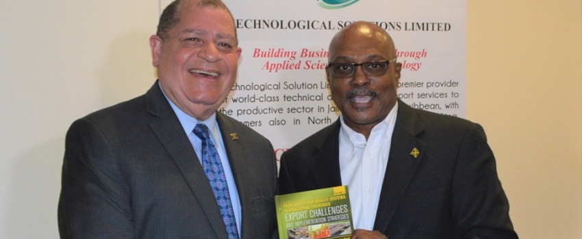 Chairman, Technological Solutions Limited, Dr. Andre Gordon (left), presents a copy of the Food Safety and Quality Systems in Developing Countries, Vol 1: Export Challenges and Implementation Strategies book to the Minister of Industry, Commerce, Agriculture and Fisheries, Hon. Audley Shaw, at the World Standards Day (WSD) Reception, hosted by Technological Solutions Limited at the Courtleigh Hotel & Suites, New Kingston on Monday, October 14, 2019. The reception was held in recognition of WSD, celebrated on October 14 each year. TSL provides solution-oriented technical assistance to various players in the small and medium-sized enterprises, private sector and support institutions in Jamaica, other Caribbean countries, Canada, Southern Africa, the United Kingdom and the European Union.