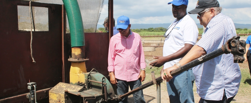 Dairy farmer Oral Wallace (centre) discusses equipment used on his farm in Rhymesbury, Clarendon, with Minister of Industry, Commerce, Agriculture and Fisheries Hon Karl Samuda (left) and Member of Parliament for Clarendon South Western Noel Arscott. Over 60 farmers from St. Thomas, St. Elizabeth and Clarendon benefitted from fertilizers that were specially blended by Newport-Fersan for pasture development, valued at $3m and donated by the Jamaica Dairy Development Board.