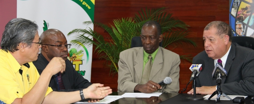 Andre Kong (left), Director of Fisheries in the Fisheries Division of the Ministry of Industry, Commerce, Agriculture and Fisheries (MICAF), speaking at a media briefing on the conch industry at the Ministry’s Hope Gardens offices in St. Andrew on March 12, 2019. Others from right are the Hon Audley Shaw, Minister of Industry, Commerce, Agriculture and Fisheries, Hon J.C. Hutchinson, Minister without Portfolio, MICAF and Dermon Spence, Acting Permanent Secretary, MICAF.