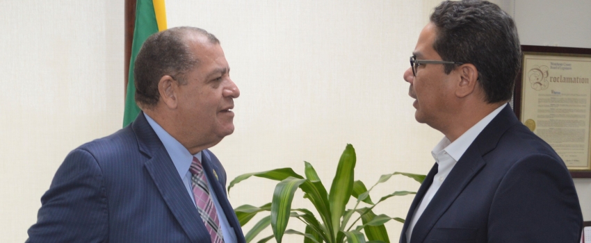 Minister of Industry, Commerce, Agriculture and Fisheries, Hon. Audley Shaw (left), converses with Food and Agriculture Organization (FAO) Representative in Jamaica, The Bahamas and Belize, Juan Cheaz Peláez, during a courtesy call at the Ministry’s New Kingston offices on Wednesday, May 8, 2019. Minister Shaw and Mr. Peláez discussed opportunities for further cooperation between the Ministry and the FAO.