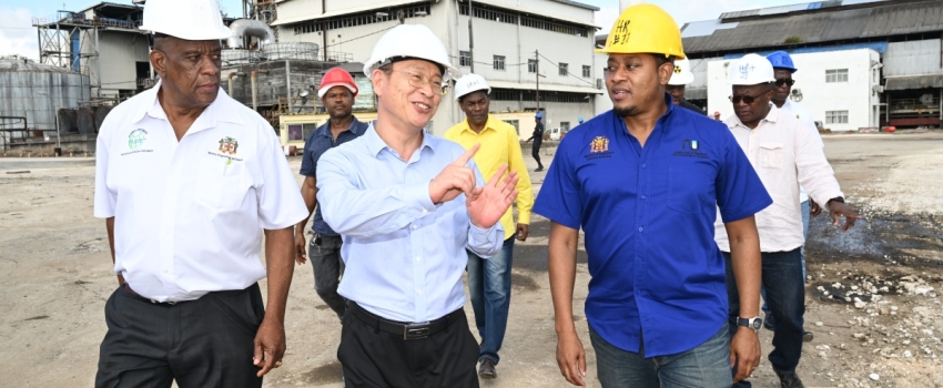 Minister of Agriculture, Fisheries and Mining, Hon. Floyd Green (right), and State Minister in the Ministry, Hon. Franklin Witter (left), listen to a point from Pan Caribbean's Chairman and Chief Executive Officer (CEO), Zudui Zhang, during a tour of the Frome Sugar Factory in Westmoreland on Wednesday (January 8).