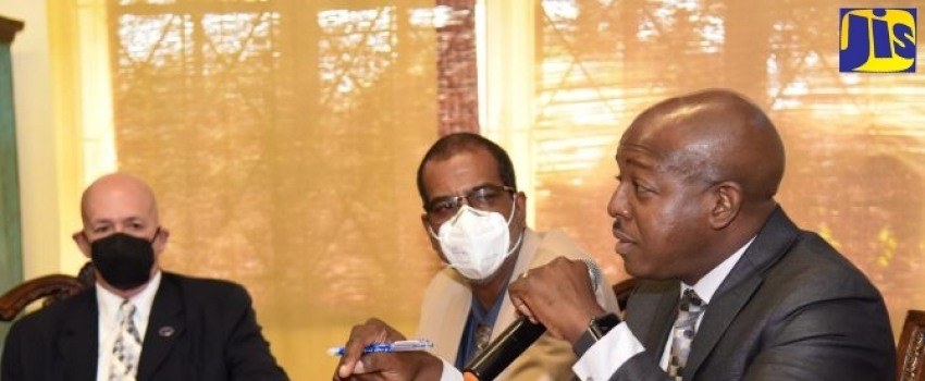 Minister of Agriculture and Fisheries, Hon. Pearnel Charles Jr. (right), fields questions during Jamaica’s launch of the International Year of Artisanal Fisheries and Aquaculture (IYAFA) 2022 on Tuesday (March 22) at Hope Zoo, St. Andrew. The event was organised by the National Fisheries Authority (NFA). Also pictured (from left) are Chairman of the NFA Board, Lt. Cmdr. George Overton; and Chief Executive Officer of the NFA, Dr. Gavin Bellamy.