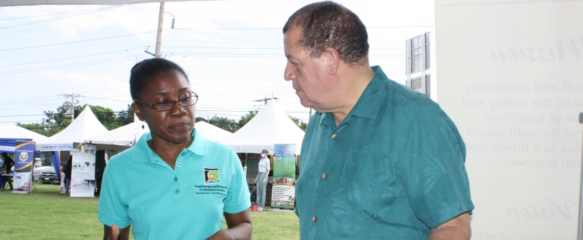 Industry, Commerce, Agriculture and Fisheries Minister, Hon. Audley Shaw (right), listens attentively to Acting Chief Food Storage Officer in the Food Storage and Prevention of Infestation Division (FSPID), Tamara Moore at an open day hosted by FSPID, at the playfield of the Hope Gardens’ offices of the Ministry in Kingston on October 31.
