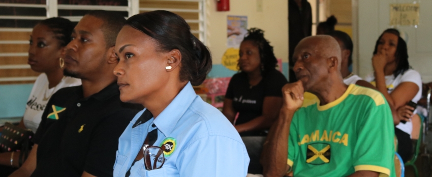 Minister of State in the Ministry of Industry, Commerce, Agriculture and Fisheries, Hon Floyd Green (2nd right) along with Community Development Officer, SDC, Jennifer Mullings (right) and members of Mountainside, St. Elizabeth listen attentively to the presentation being made on the Alternative Development Programme. The sensitization session organized by the Ministry in collaboration with the Social Development Commission and the Cannabis Licensing Authority was held at the Mountainside Primary, St. Elizabeth on Friday, February 20, 2020.