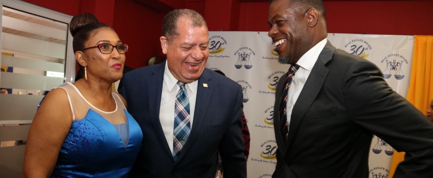 Hon Audley Shaw (centre), Minister of Industry, Commerce, Agriculture and Fisheries, shares a light moment with (from left) Sandra Garrick, Chief Executive Officer, and Kevin Richards, Chairman, both of the Real Estate Board (REB). The occasion was the REB’s 30th Anniversary Banquet & Awards Ceremony, held at the Spanish Court Hotel in New Kingston on October 6. Minister Shaw commended the REB for its stewardship and urged the REB and its practitioners to continue the drive to support the Anti-Money Laundering legislation and enforcement initiatives of the Government.