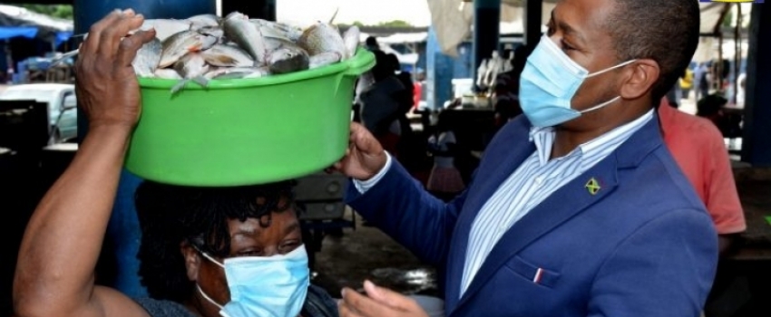 Minister of Agriculture and Fisheries, Hon. Floyd Green (right), in discussion with fish vendor at the Old Harbour Bay fishing beach in St. Catherine, Joan Bailey, during a recent tour of the facility.