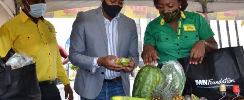 Minister of Agriculture and Fisheries, Hon. Floyd Green (centre), examines a bag of peppers during a tour of the J Wray and Nephew Limited Farmers’ Market earlier this year at the company’s Spanish Town Road address, St. Andrew. Care packages were distributed to 286 bartenders employed to the spirits company and its affiliates. Also pictured are Director of Marketing, Jamaica and the Caribbean, J Wray and Nephew, Marsha Lumley (right) and Chief Executive Offi