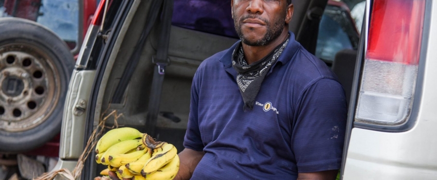 Farmer from Brandon Hill, in St. Andrew, Kevin McLaren, displays ripe bananas and a breadfruit from his farm, during a Farmers’ Market on July 3, at the Ministry of Industry, Commerce, Agriculture and Fisheries playfield, in St. Andrew.