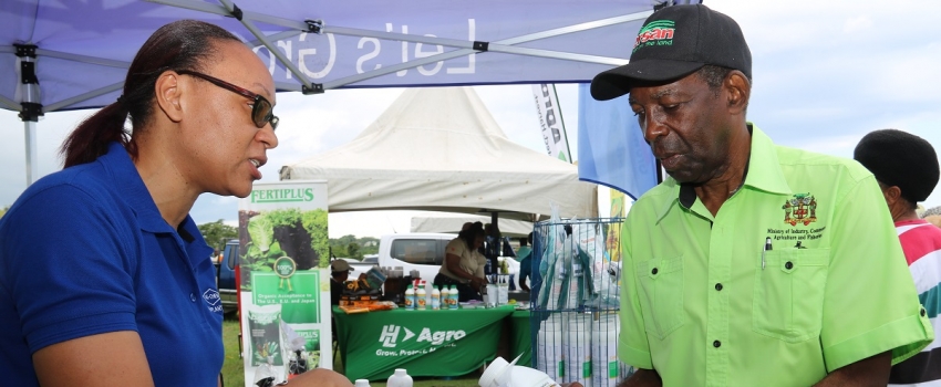 Georgina Robinson, marketing coordinator at AG-CHEM Plant Limited, introduces the Hon J.C. Hutchinson, Minister without Portfolio in the Ministry of Industry, Commerce, Agriculture and Fisheries, to BotaniGard, one of the products being marketed by the company that was on display at the 4th staging of the Hanover Agricultural Show in Lucea, Hanover, on May 25. BotaniGard is a biological insecticide which is said to be safe for use with no negative impact on people, pets and plants.