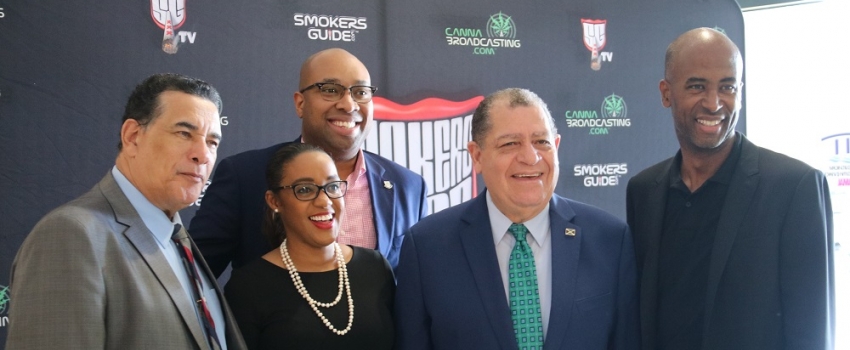 Industry, Commerce, Agriculture and Fisheries Minister, Hon. Audley Shaw (second right), shares in a group photo opportunity at the 4th staging of the CanEx Jamaica Business Conference, at the Montego Bay Convention Centre in St. James on September 26. From left are Mayor of Montego Bay, His Worship, Councillor Homer Davis, Chief Executive Officer of Zimmer and Company, T’Shura Gibbs, Chairman of the Cannabis Licensing Authority, Delano Seiveright, and Founder of CanEx Jamaica, Douglas Gordon.