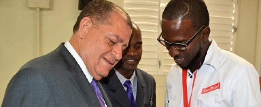 Home | Hon. Audley Shaw autographs a copy of the ‘Understanding Options for Agricultural Production’ book for Crop Production Supervisor Michael Williams