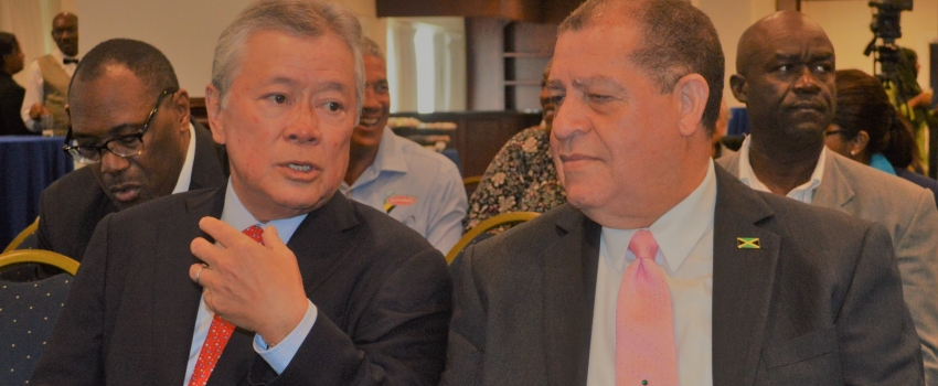 Minister of Industry, Commerce, Agriculture and Fisheries, Hon. Audley Shaw (right), converses with Chairman and CEO, National Baking Company, Butch Hendrickson, at a press conference, held at The Jamaica Pegasus hotel, on Tuesday, April 10, 2018, to announce plans for Expo Jamaica 2018, the company’s e-Commerce platform and its 100% biodegradable bags.