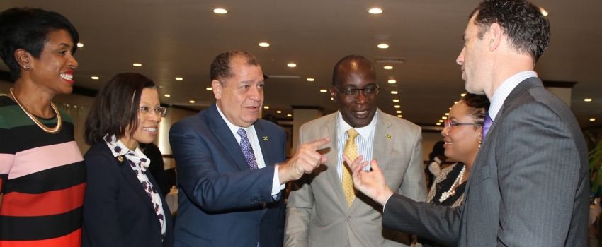 Hon Audley Shaw (3rd left), Minister of Industry, Commerce, Agriculture and Fisheries, converses with Neil Herrington (right), Senior Vice-President, Americas Department US Chamber of Commerce, at the AMCHAM Jamaica meeting held at The Jamaica Pegasus in Kingston on June 22. Others from left are Ann-Dawn Young Sang, President & CEO Supreme Ventures and Vice-President, AMCHAM; Allison Peart, President, AMCHAM Jamaica; Senator Ruel Reid, Minister of Education, Youth and Information, and Gail Abrahams, CEO, AMCHAM Jamaica.