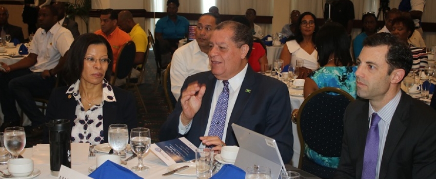 Hon Audley Shaw (centre), Minister of Industry, Commerce, Agriculture and Fisheries, in discussion with (from left) Allison Peart, President, AMCHAM Jamaica, and Neil Herrington, Senior Vice-President, Americas Department US Chamber of Commerce, at the AMCHAM Jamaica meeting held at The Jamaica Pegasus in Kingston on June 22 under the theme ‘The US Regional Trade Agenda’. Hon Audley Shaw (centre), Minister of Industry, Commerce, Agriculture and Fisheries, in discussion with (from left) Allison Peart, President, AMCHAM Jamaica, and Neil Herrington, Senior Vice-President, Americas Department US Chamber of Commerce, at the AMCHAM Jamaica meeting held at The Jamaica Pegasus in Kingston on June 22 under the theme ‘The US Regional Trade Agenda’.