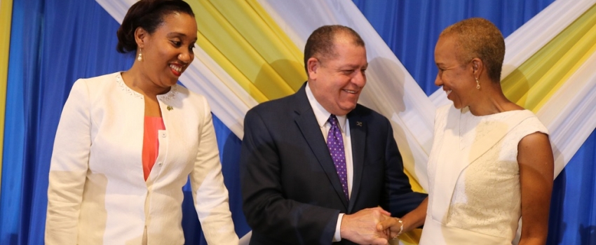 Hon. Audley Shaw, Minister of Industry, Commerce, Agriculture and Fisheries, greets the Hon. Fayval Williams, Minister without Portfolio in the Ministry of Finance and the Public Service, at the opening ceremony of the Jamaica Electronic Single Window Project Mobilization Seminar, held at the Jamaica Pegasus hotel in Kingston on September 5. At left is Commissioner of Customs, Velma Ricketts Walker.