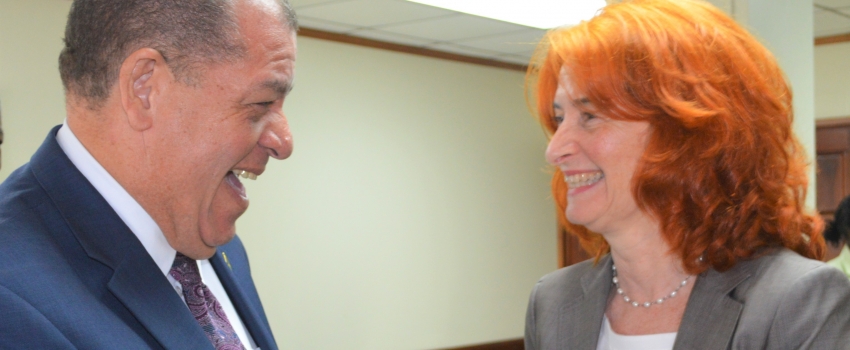 Minister of Industry, Commerce, Agriculture and Fisheries, Hon. Audley Shaw (left), greets Regional Vice-President for Latin America and the Caribbean (LAC), Europe and Central Asia (ECA), Ms Georgina Baker, during a meeting at the Ministry’s New Kingston offices on Tuesday, May 21, 2019. Among the matters discussed was assistance with priority crops identified for expansion such as coconuts, mangoes, coffee, cocoa, ginger and Scotch bonnet pepper.