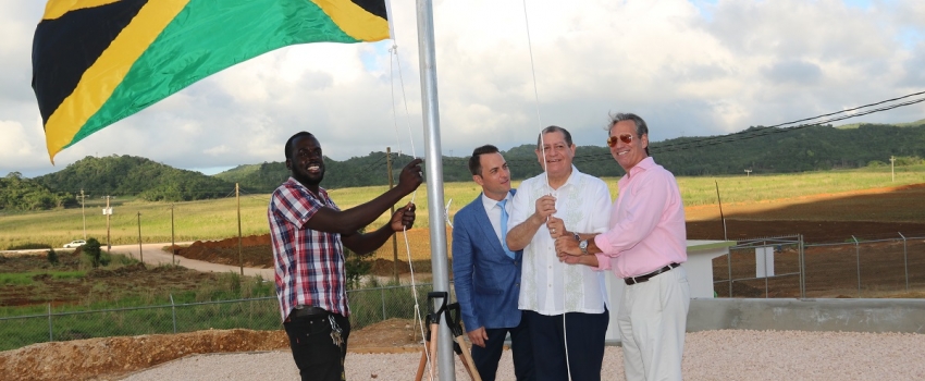 Hon Audley Shaw (2nd right), Minister of Industry, Commerce, Agriculture and Fisheries, and Robert Weinstein, Co-Founder & President, Organic Growth Holdings, Inc., participate in flag-raising exercise at the official ground-breaking ceremony for the OGH Grow Jamaica Craft Medicinal Hemp Farm assisted by Devon Lawrence (left) at the Long Pond Estate in Trelawny on December 11, 2019. Looking on is Shawn Rogers, Vice-President, OGH Grow Jamaica. The 365-acre farm provides employment for several former sugar cane workers in the surrounding communities and will produce CBD oil for both the local and international markets.