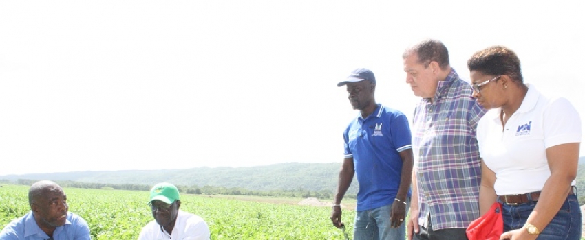 Industry, Commerce, Agriculture and Fisheries Minister, Hon. Audley Shaw (second right), listens attentively as Special Crop Coordinator in the Ministry, Locksley Waite (left) explains the process of planting Irish potato during a tour of Dencon Foods Jamaica Limited in Spring Plain, Clarendon on February 7. Others from second left are Vice President of Farming Operations at Dencon Foods Jamaica Limited, Nicholas Duke, Principal Director of Field Services at the Rural Agricultural Development Authority (RADA) Winston Simpson and Director of Dencon Foods Jamaica Limited, Sophia Campbell. Minister Shaw was invited by the proprietors of the farm to view production of selected crops such as onions, peanuts and Irish potatoes.