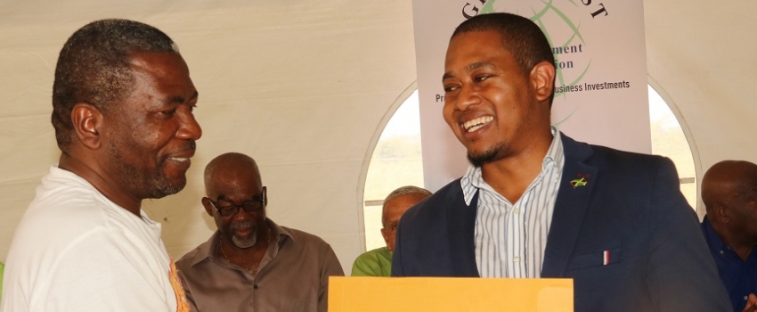 Minister of State in the Ministry of Industry, Commerce, Agriculture and Fisheries, Hon. Floyd Green (right), congratulates Solomon Anderson, a beneficiary of the agricultural component of the Government’s Socio Economic Programme for Former Employees of the Monymusk Sugar Factory, with a lease for lands, at the launch of the project in Hermitage, Clarendon on February 20.