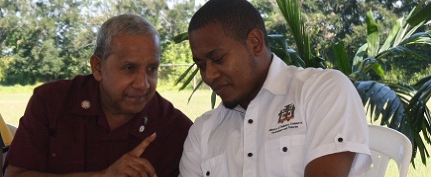 State Minister in the Ministry of Industry, Commerce, Agriculture and Fisheries, Hon. Floyd Green (right) gives a listening ear to Mayor of May Pen, Winston Maragh (centre), at a job fair hosted by the HEART/Trust NTA in collaboration with the Ministry of Industry, Commerce, Agriculture and Fisheries, the National Irrigation Commission (NIC) and the Rural Agricultural Authority (RADA), at Pawsey Park in Lionel Town, Clarendon on November 29. The job fair sought to target displaced sugar workers, their families, and community members from the Monymusk area and is a planned strategy by the Government to provide assistance to the displaced sugar workers.
