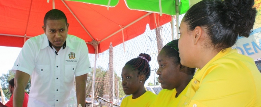 State Minister in the Ministry of Industry, Commerce, Agriculture and Fisheries, Hon. Floyd Green (left), is in discussion with Assessment Monitoring Officer, at the Ebony Park HEART Academy in Clarendon, Shanieka Worrie (right), at a job fair hosted by the institution in collaboration with the Ministry of Industry, Commerce, Agriculture and Fisheries, the National Irrigation Commission (NIC) and the Rural Agricultural Authority (RADA), at Pawsey Park in Lionel Town, Clarendon on November 29. Seated from second left are HEART Trust/NTA Volunteers, Anesa Whittingham and Shelbe Graham. The job fair sought to target displaced sugar workers, their families, and community members from the Monymusk area and is a planned strategy by the Government to provide assistance to the displaced sugar workers.