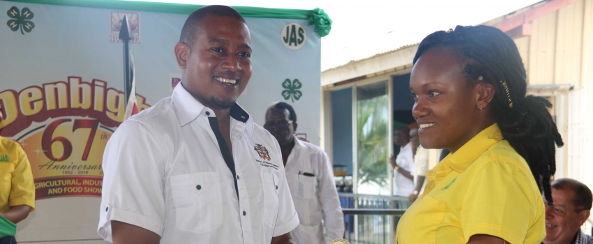 State Minister in the Ministry of Industry, Commerce, Agriculture and Fisheries, Hon Floyd Green, presents the winning trophy for Agro Business/Agro-Industry to Tiffany Moorhouse, Jamaica Agricultural Society Trelawny Parish Manager, at the official ceremony of the 67th staging of the Denbigh Agricultural, Industrial and Food Show on August 6.