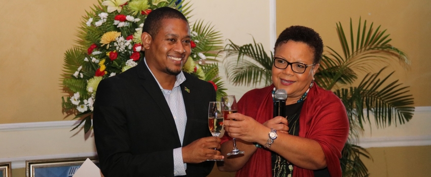 State Minister in the Industry, Commerce, Agriculture and Fisheries Ministry, Hon. Floyd Green (left), raises a toast with Country Representative of the Inter-American Institute for Cooperation on Agriculture (IICA) Dr. Elizabeth Johnson, at the annual accountability seminar and cocktail reception, at the Terra Nova All-Suite Hotel in St. Andrew on December 4.