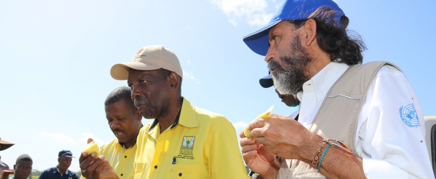 Home | Hon J.C. Hutchinson and FAO Representative Dr Crispim Moreira taste cantaloupe cultivated on the Holland Agro-Economic Zone