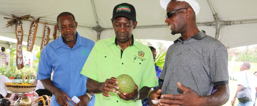 Kevin Reid (right), farmer from Rock Spring, discusses benefits of mountain sop with the Hon. J.C. Hutchinson (centre), Minister without Portfolio in the Ministry of Industry, Commerce, Agriculture and Fisheries, during a tour of the Rock Spring Farmers’ Group booth at the 4th staging of the Hanover Agricultural Show in Lucea, Hanover, on May 25. Listening in at left is Owen Dobson, 2nd Vice-President of the Jamaica Agricultural Society.