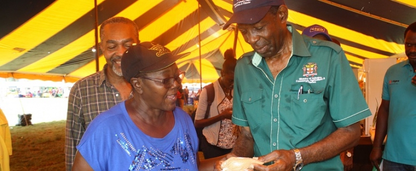Theressa Ewers of the Knoxwood Production and Marketing Organisation, speaking with the Hon. J.C. Hutchinson, Minister without Portfolio in the Ministry of Industry, Commerce, Agriculture and Fisheries, about corn sham on display at the Rural Agricultural Development Authority St. Bess Agri-Fest held at the SDC Complex in Santa Cruz, St. Elizabeth, on May 31.