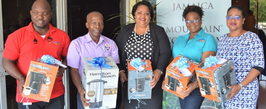 Principal Director in the Ministry of Industry, Commerce, Agriculture and Fisheries (MICAF), Michelle Parkins (right); and Senior Director, Human Resource Management Department, MICAF, Deidre Latibeaudiere (centre) along with (from left) Warehouse Supervisor, Jamaica Agricultural Commodities Regulatory Authority (JACRA), Nicholas Carrol; Senior Director, Coffee Division, JACRA, Hervin Willis and Senior Administrator, JACRA, Fermin Francis, at the Ministry’s New Kingston offices, on Thursday, January 9, 2020. The occasion was Jamaica Blue Mountain Coffee Day, celebrated on January 9. In recognition of the day, a team from JACRA made a presentation of five (5) coffee brewers to the Ministry’s St. Lucia Avenue and Hope Gardens offices.