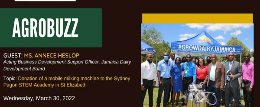 This week on AgroBuzz, Ms. Annece Heslop, Acting Business Development Support Officer discusses the Jamaica Dairy Development Board's (JDDB) recent donation of a portable milking machine to the Sydney Pagon STEM Academy in St Elizabeth. Listen at https://www.youtube.com/watch?v=mkbzcXDb6cE