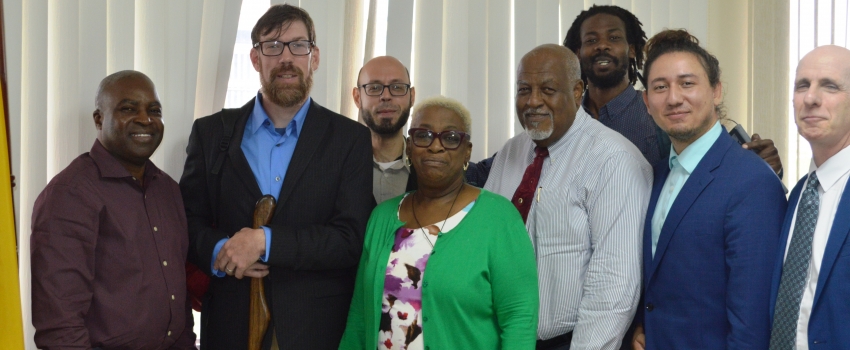 Permanent Secretary, Ministry of Industry, Commerce, Agriculture and Fisheries, Dermon Spence (left) along with Chief Operating Officer, Oakland  Licensed Professional Therapeutics (OLP); Associate Professor, College of Health Sciences, UTech, Dr. Ellen Campbell-Grizzle; Senior Advisor to Minister Shaw, Dennis Boothe; Scientific Consultant (OLP) Tomas Garrett and Founder/Chief Executive Officer, OLP, James (Jim) Keim. In background from left are; Lead Researcher, Ian Bollinger and Mushroom Cultivation Expert, OLP, Reggie Harris, during a courtesy call at the Ministry’s New Kingston office on Tuesday, October 22. The OLP team met with Ministry officials to discuss partnering with Jamaica in growing mushrooms for medicinal purposes.