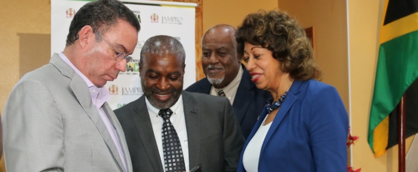From left, Hon Daryl Vaz, Minister without Portfolio in the Ministry of Economic Growth and Job Creation, Dermon Spence, Acting Permanent Secretary in the Ministry of Industry, Commerce, Agriculture and Fisheries, Dennis Boothe, Chairman of the Jamaica Agricultural Commodities Regulatory Authority, and Diane Edwards, President of JAMPRO, at the launch of the inaugural Jamaica Blue Mountain Coffee Day in St. Andrew on January 4, 2109. The Jamaica Blue Mountain Coffee Day will be celebrated in Japan and Jamaica on January 9, 2019.