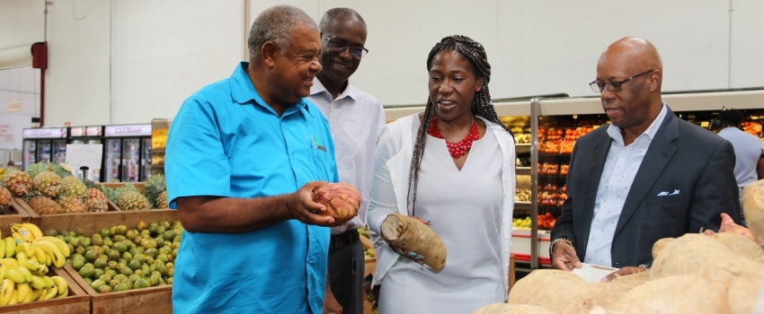 Lenworth Fulton, President, Christopher Emmanuel, CEO, both of the Jamaica Agricultural Society, Monique Gibbs, Chief Technical Director in the Ministry of Industry, Commerce, Agriculture and Fisheries, and Victor Cummings, Project Manager, Lakes Pen Agri-Ventures, view local produce on sale at MegaMart Wholesale Club in Kingston on November 8, 2019. The occasion was the launch of Eat Jamaican Month under the theme ‘Grow What We Eat … Eat What We Grow’. The month-long celebrations include Eat Jamaican School Tours and will culminate with the Eat Jamaican Day Expo on November 25 at Devon House in St. Andrew.