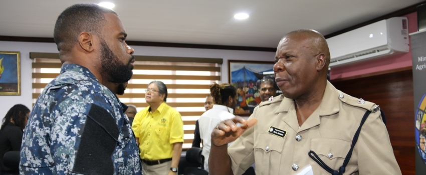 Superintendent Rex Swearing (right), Commanding Officer, Marine Police, in discussion with Lt. Leonard Wynter of the Jamaica Defence Force Coast Guard at a media briefing on the conch industry held at the Ministry of Industry, Commerce, Agriculture and Fisheries’ Hope Gardens offices in St. Andrew on March 12, 2019.