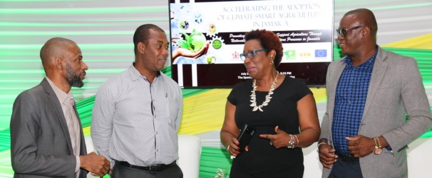 Una May Gordon, Principal Director in the Climate Change Division of the Ministry of Economic Growth and Job Creation speaking with (from left) Winston Shaw, Senior Director, Peter Thompson, Chief Executive Officer, both of the Rural Agricultural Development Authority, and Dr. Roy McNeil, Chief Technical Director, Ministry of Industry, Commerce, Agriculture and Fisheries, at the Accelerating the Adoption of Climate-Smart Agriculture in Jamaica Validation Workshop at the Spanish Court Hotel in New Kingston on July 30. Under the theme ‘Promoting Climate Finance to Support Agriculture through Nationally Determined Contributions (NDC) Processes in Jamaica’, agricultural stakeholders discussed mechanisms to raise the profile of agriculture in the implementation of NDCs in the country.