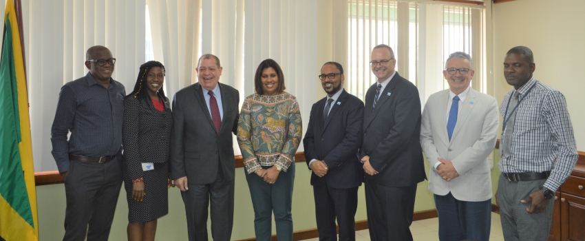 Minister of Industry, Commerce, Agriculture and Fisheries, Hon. Audley Shaw (3rd left), along with (from left) Chief Technical Director for Special Projects for the Agriculture Portfolio, Roy McNeil; Chief Technical Director for the Industry Portfolio Monique Gibbs; Chief Executive Officer, Caribbean Catastrophe Risk Insurance Facility Segregated Portfolio Company (CCRIF SPC), Isaac Anthony; Chief Risk Management Officer, CCRIF SPC, Dr. Michael Spranger; Dr. Mario Ordaz Schroeder, Risk Management Team, CCRIF SPC; and International Trade Specialist in the Ministry, Dennis Crawford, during a courtesy call at the Ministry’s New Kingston offices on Thursday, October 10, 2019. Mr. Anthony and his team met with the minister and other Ministry representatives to explain new programmes and policies offered by the Facility and discussed how the Facility can strengthen its engagement with member governments like Jamaica. CCRIF SPEC was created to limit the financial impact of catastrophic hurricanes, earthquake and excess rainfall.