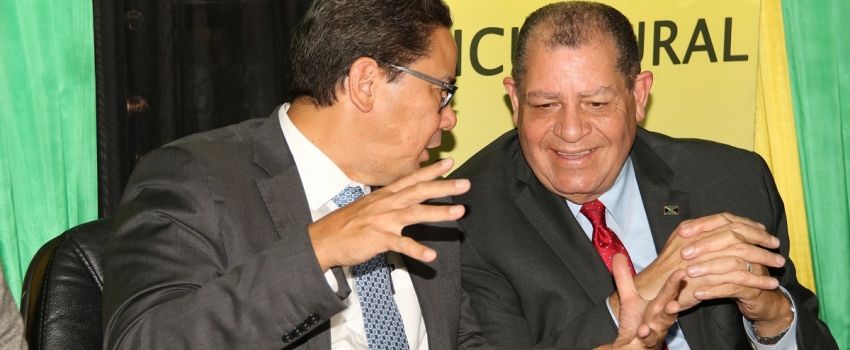 Industry, Commerce, Agriculture and Fisheries Minister, Hon. Audley Shaw (right) listens to a point made by Trade and Markets Officer of the Food and Agriculture Organization (FAO), Juan Cheaz, at a Jamaica Agricultural Society press conference, held at its offices in downtown Kingston on September 11.