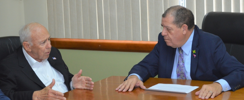 Minister of Industry, Commerce, Agriculture and Fisheries, Hon. Audley Shaw (right) converses with Ambassador of the United States, H.E. Donald R. Tapia, during an introductory courtesy call at the Ministry’s New Kingston offices on Wednesday, October 30, 2019. Ambassador Tapia and his team met with Minister Shaw and other Ministry representatives to discuss trade relations between the two countries, in particular the importation of pork from the US; Jamaica’s cannabis industry; Intellectual Property; mutual benefits of continued cooperation on border control, among other things.